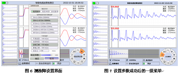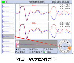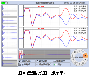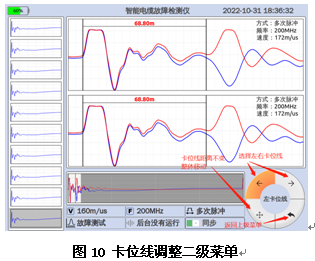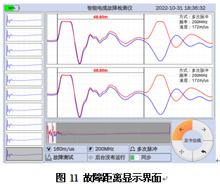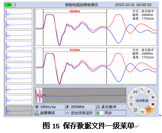 光標定位時,調整左側標線到沖閃波形上升沿為起點,然后調整右側標線到下一個周期上升沿前端的下降沿為終點,屏幕中間信息顯示區顯示距離即為故障預定位距離。