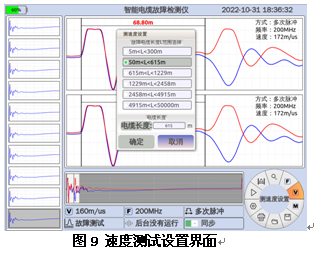 如圖26所示,旋轉旋鈕使得焦點切換至,按下旋鈕按鍵進入速度測試界面,如圖27所示。按下旋鈕按鍵,焦點在電纜長度、故障電纜長度L范圍選擇、確認、取消之間切換。