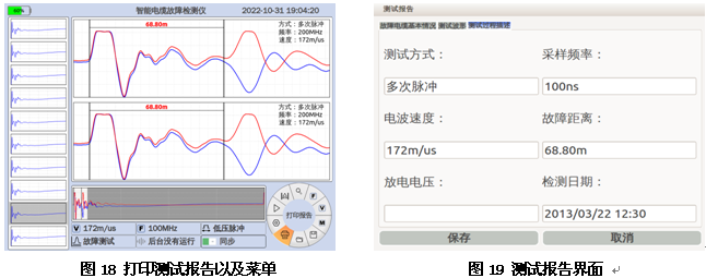 插上U盤稍等2、3秒后(U盤需要一定的掛載時間),按照“打開歷史數據"操作方法選擇某組數據,然后如圖18所示,旋轉旋鈕使得焦點切換至,按下旋鈕按鍵打開測試報告界面,然后如圖19所示切換焦點到確認按鍵上,按下旋鈕按鍵,即可將該組數據生成的報告保存至U盤。
