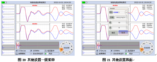 如圖23所示,旋轉旋鈕使得焦點切換至,左側顯示“測故障設置"。按下旋鈕按鍵進入測故障設置界面,如圖24所示。旋轉旋鈕可在測試方式、故障電纜長度L范圍選擇、介質選擇、延遲系數、確定、取消之間切換焦點。