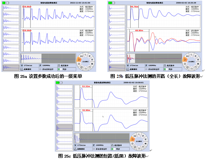 低壓脈沖用于測試電纜中電波傳播的速度、電纜全長、低阻故障(故障相電阻值低于1K)和開路故障及短路故障,主機即可完成任務,無須LYST-600E產生器。同時給下一步應用法測試電纜高阻故障提供了依據。